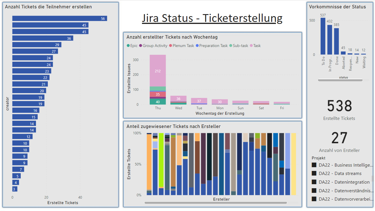 Im Folgenden werden die Dashboards und verwendeten Visualisierungen der oben bereitgestellten Vorlagen für den Jira Status Report erläutert.