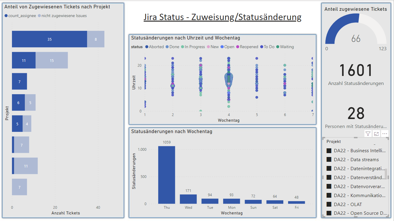 - Damit wird die Frage "Wie verteilten sich die Statusänderungen auf die einzelnen Wochentage?" adressiert.